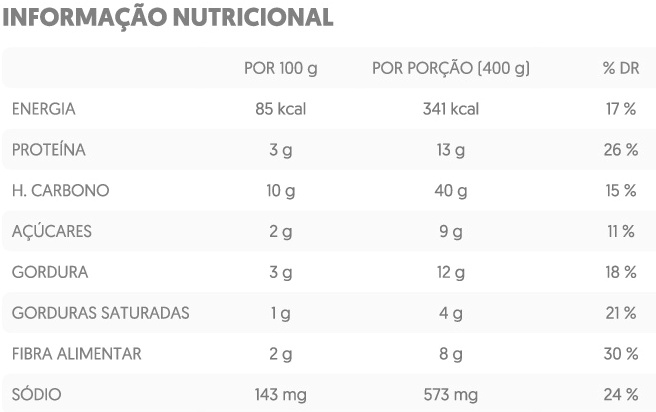 batata, polpa de tomate, leite de soja, proteína de ervilha (18%), óleo de semente de nabo, glúten de trigo, cebola, pimento vermelho, margarina vegetal, noz moscada, coentros em pó, gengibre em pó, oregãos.