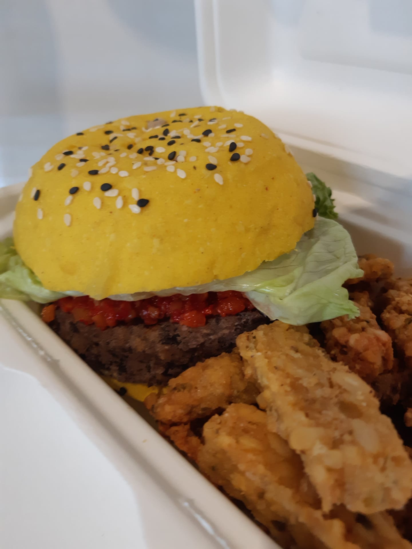 Delicioso hamburguer de tofu. Abóbora e nozes, cebola caramelizada em pão de hamburguer com alface e maionaise vegan. Acompanha com umas crocantes fritas de grão de bico. A IMAGEM É ILUSTRATIVA