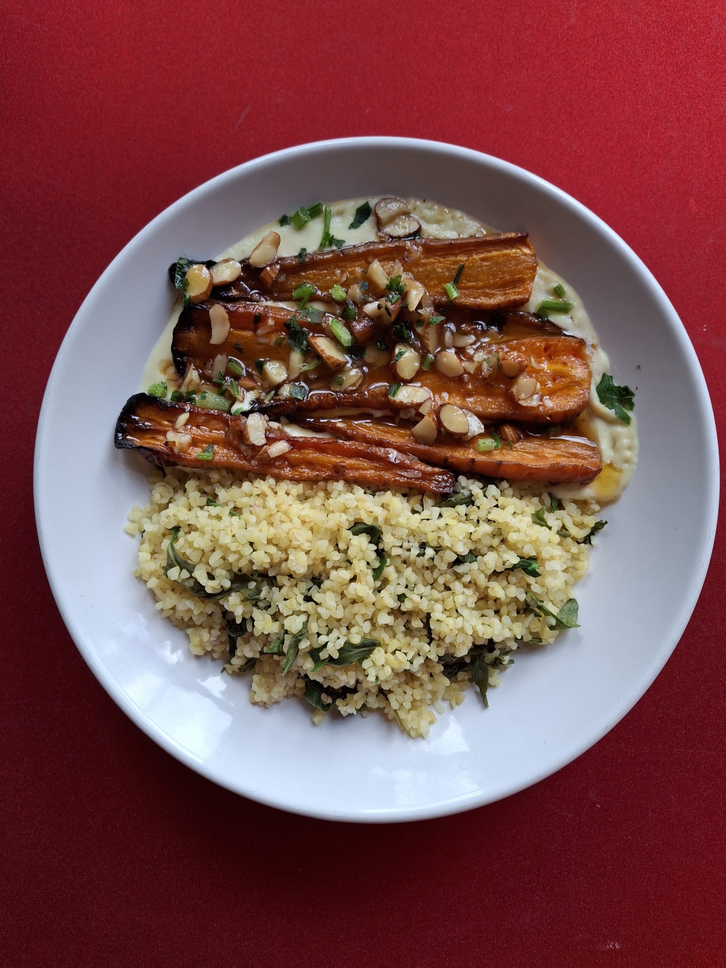 Cenouras assadas, bulgur, creme de espargos brancos e óleo de laranja e amêndoas