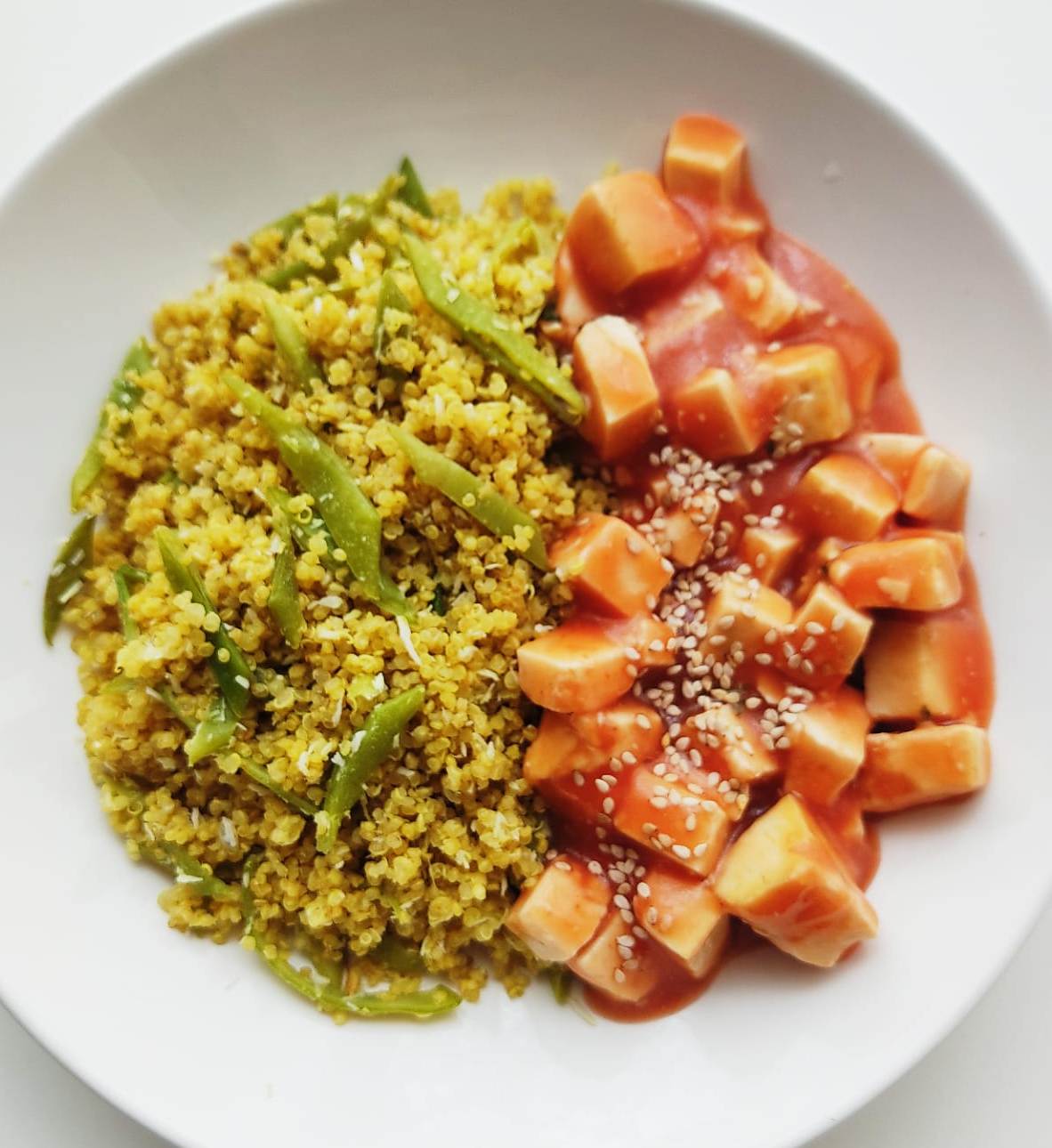 tofu, quinoa, leite de coco, feijão verde, polpa de tomate, vinagre de sidra, açúcar mascavado, cebola, coco ralado, caril, gengibre, amido de milho, sementes de sésamo, sal marinho, azeite.