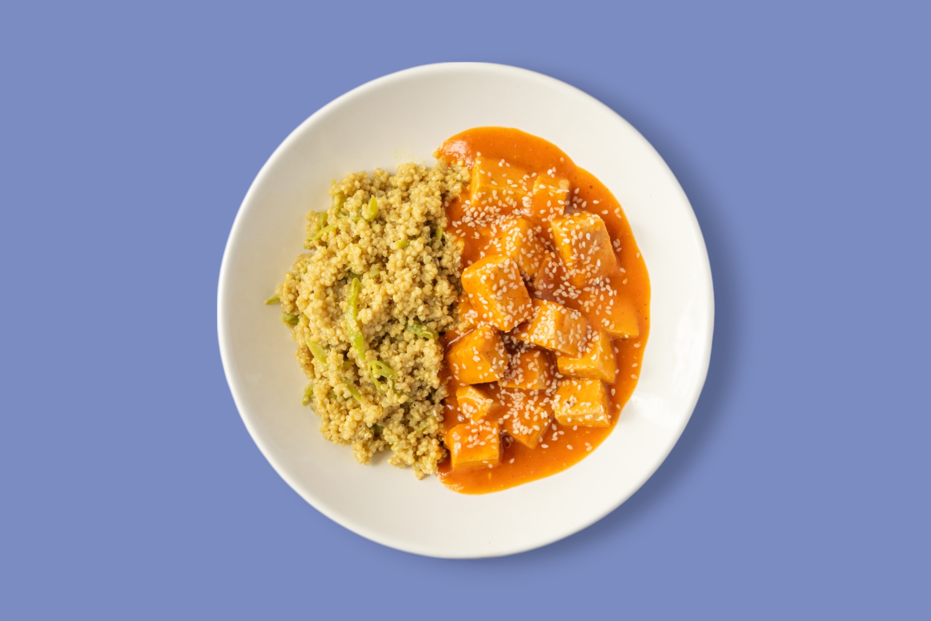 Adaptação de sabores do oriente numa combinação perfeita da quinoa cozida em leite de coco, com coco ralado e feijão verde e o tofu caramelizado num molho agridoce polvilhado com sementes de sésamo. Uma delícia. 400g aprox