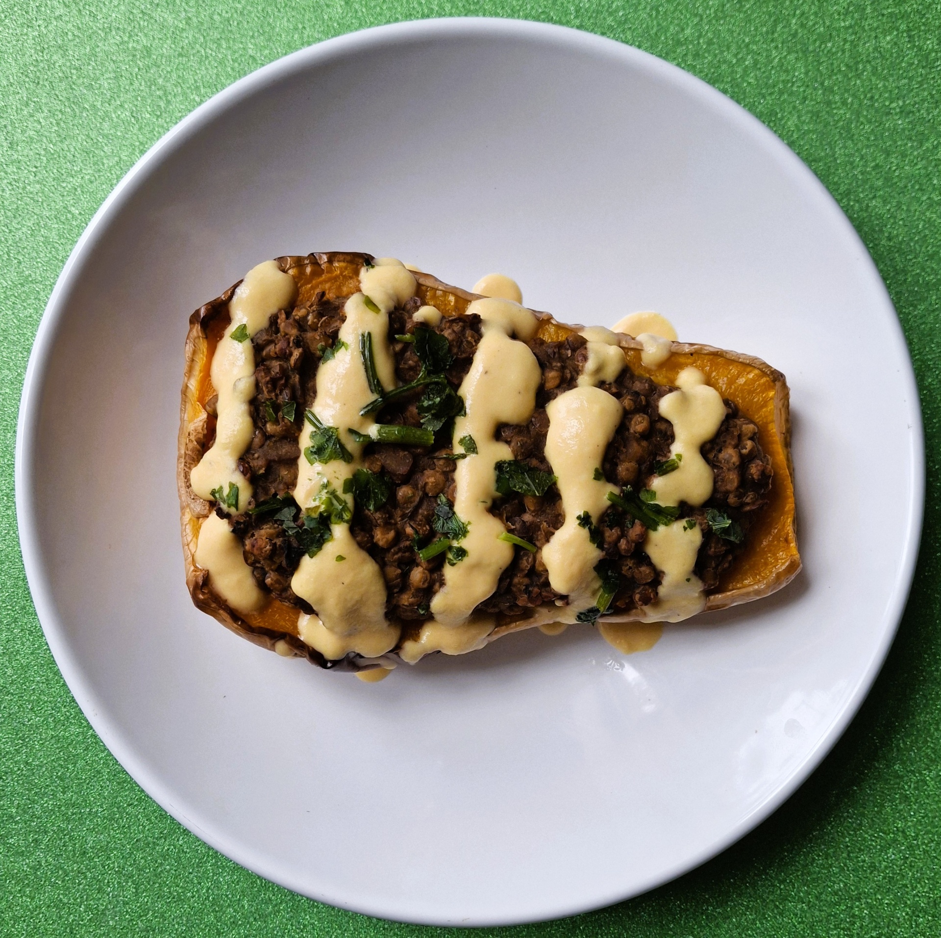 Butternut recheada c castanhas e lentilhas cremosas