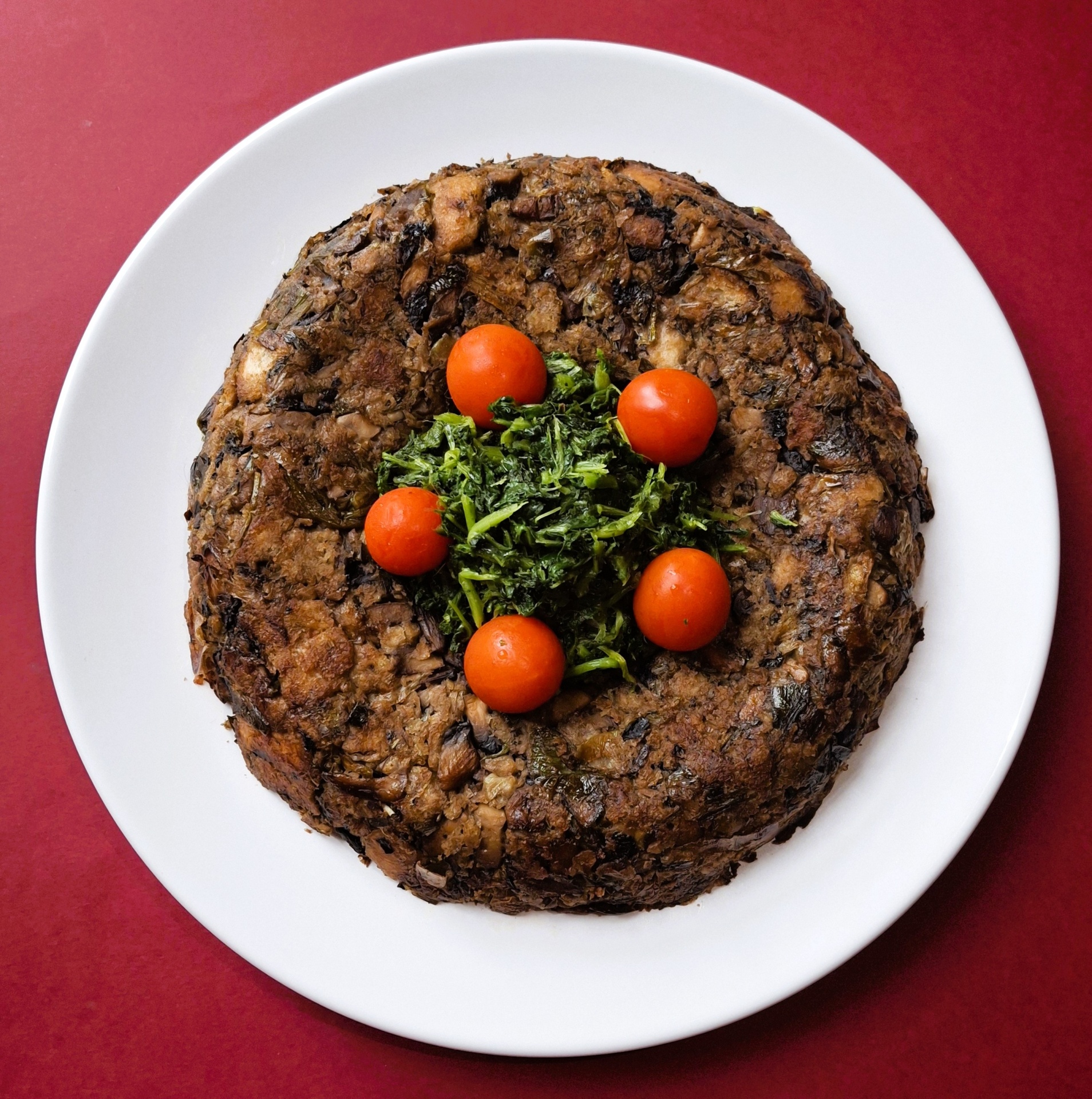 Deliciosa coroa de cogumelos, suculenta e que acompanha com grelos salteados e tomatinhos. Cheio de cor, cheio de sabor. Uma festa à mesa.